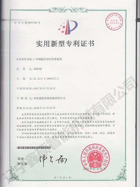 Certificate of utility model for C-type steel conveying buckle stacking device