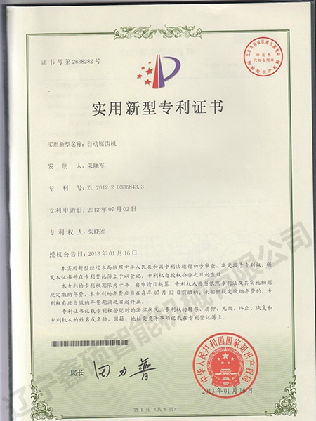 Utility model certificate of automatic saw tooth machine
